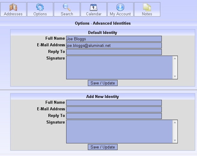 When you are finished, just click any one of the SAVE/UPDATE boxes. It will save all of the changes you have made. When you want to send from another identity, just go to compose a message, click on the drop down box labeled FROM, and choose which email address you want to use.